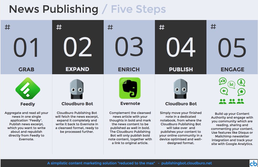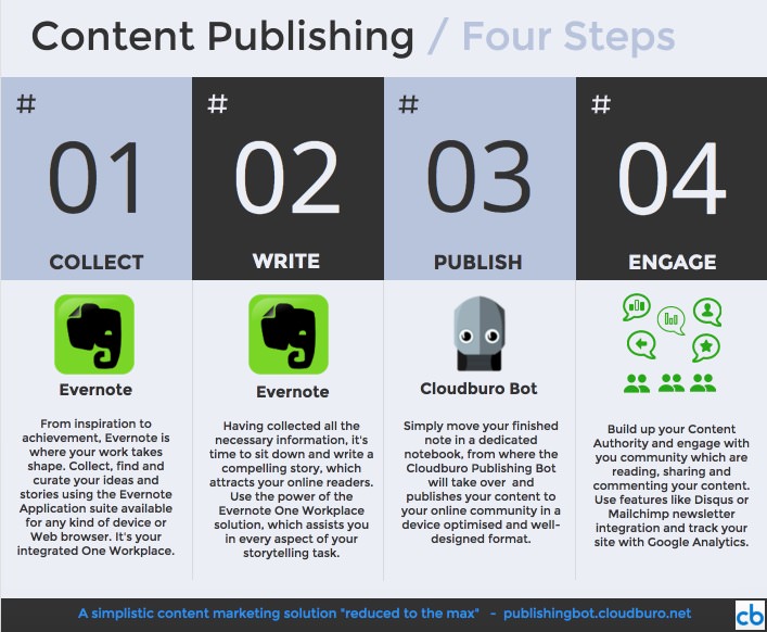 Take a tour by studying the following infographics or watching the short introduction videos. It gives you a good overview how easy you can produce content by using the Evernote One Workspace solution in combination with the Cloudburo Publishing Bot.